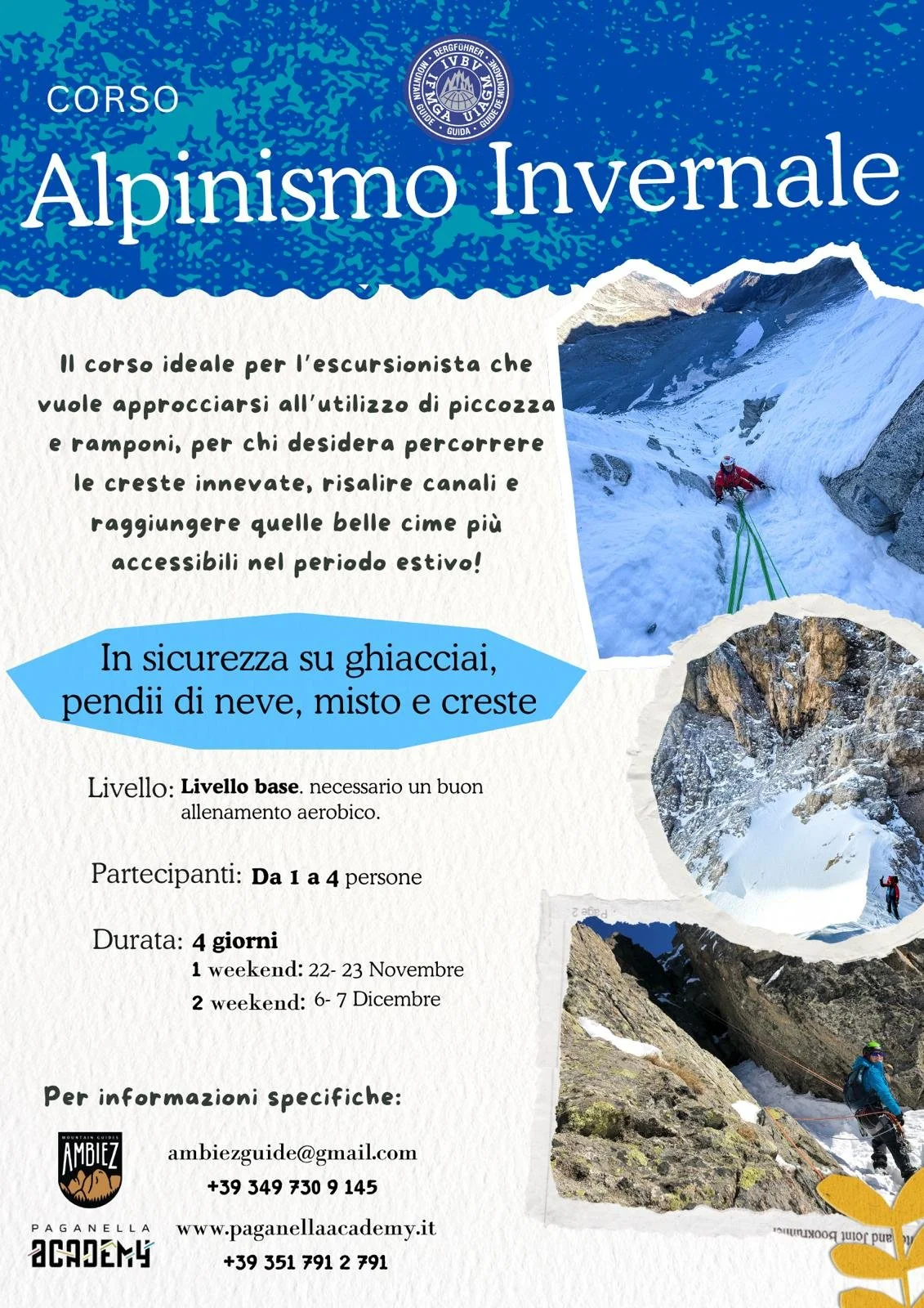 Il corso ideale per l’escursionista che vuole approcciarsi all’utilizzo di piccozza e ramponi, per chi desidera percorrere le creste innevate, risalire canali e raggiungere quelle belle cime più accessibili nel periodo estivo!